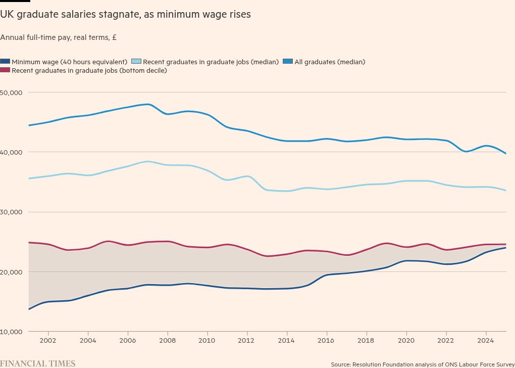 Meanwhile, many feel the returns on university education are weakening. The UK minimum wage is closing in on the pay earned by graduates, which has stagnated. The country’s graduate earnings premium has eroded while higher education has expanded, making it an international outlier, as my colleague John Burn-Murdoch recently showed.