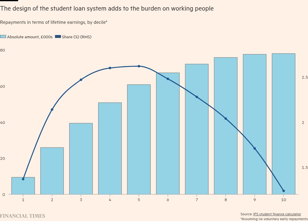 Another drag comes from the student loan system. Repayments add around 9 percentage points to marginal income tax rates above a specific salary threshold, which was also frozen in the autumn Budget. The repayment schedule is a particular burden for English graduates who started university between 2012 and 2022. Relative to previous cohorts, they paid higher tuition fees and dearer interest rates. Indeed, over two-thirds of the youngest graduates in this group are forecast never to repay their debt in full, so repayments become akin to a career-long tax.