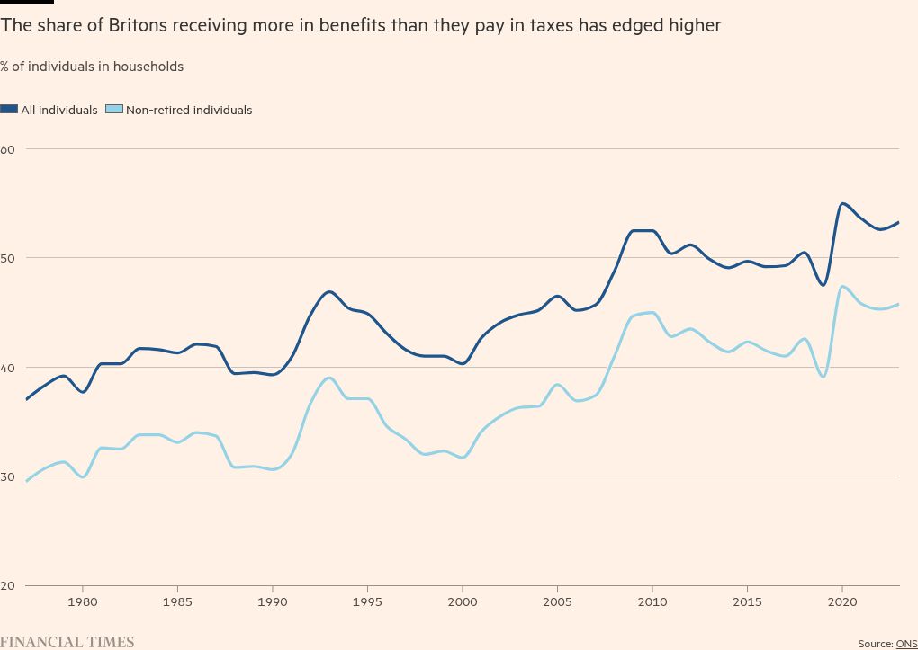 Then there is the rising burden of welfare costs. Sickness and ageing put greater demands on taxpayers, particularly when growth is wanting. The “triple lock” on state pensions — which ensures payments rise annually by the highest of inflation, average wage growth or 2.5 per cent — is particularly unsustainable. In recent years the proportion of UK adults who are net recipients of the state overtook the number of net contributors.