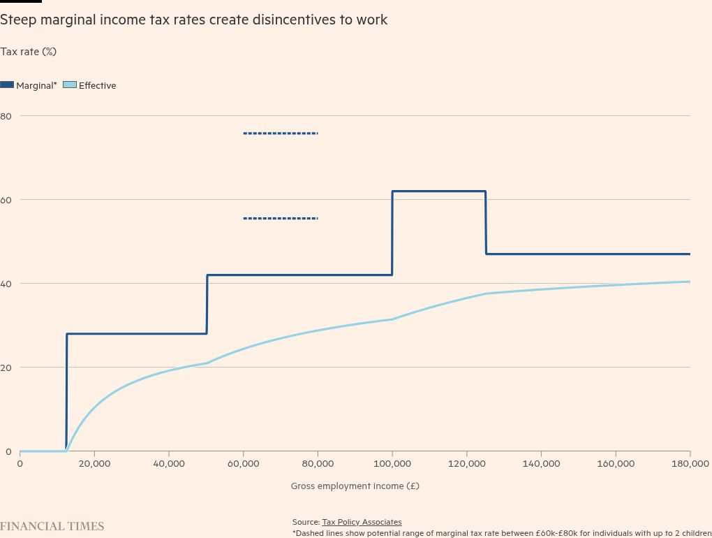 Take the income tax system. Though the top rate isn’t high by European standards, cliff edges caused by the withdrawal of a tax-free personal allowance, child benefit and subsidised childcare can result in steep marginal tax rates of more than 60 per cent.